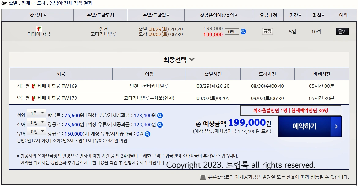 출발 날짜는 23년 8월 29일(화), 도착 날짜는 23년 9월 2일 (토)이며 유류세와 모든 세금 포함 199,000원입니다.
