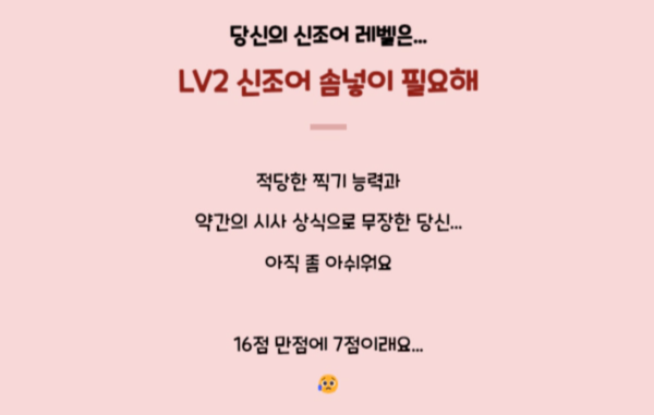 저는 신조어 테스트 해보니 16점 만점에 7점이 나왔습니다...
