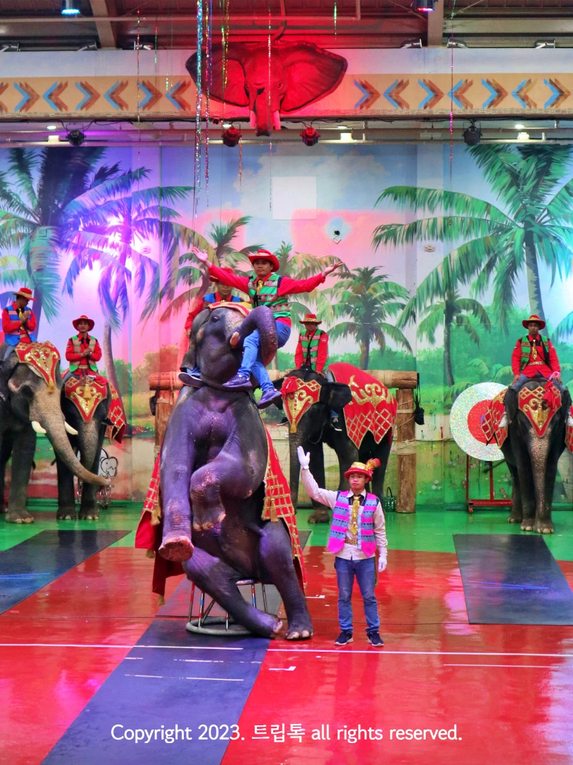뒷발로 선 코끼리 위에 등을 타고 다람쥐처럼 올라가는 조련사들을 보니 서커스를 보는 거 같은 기분도 들었습니다.