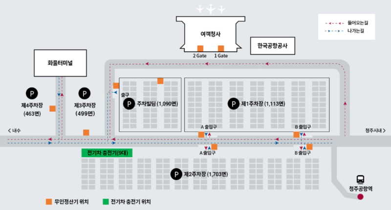 청주공항 주차장은 제1,2,3,4 주차장이 있지만 평소에는 1,2 주차장을 우선 개방하고 만차인 경우는 3,4 주차장을 운영합니다.